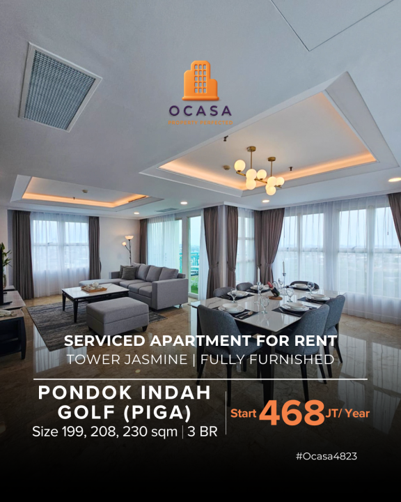 Apartemen minimalis disewakan di Pondok Indah, Jakarta Selatan, LB 199m², 3 KT & 3 KM. Harga sewa murah: 468 Juta /tahun. Cocok untuk pasangan muda.