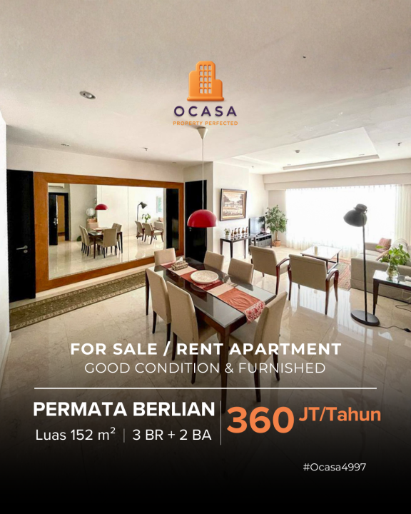 Sewa apartemen murah di Permata Hijau, Jakarta Selatan, LB 152m², 3 KT. Harga sangat terjangkau 360 Juta /tahun. Ideal untuk karyawan atau mahasiswa.