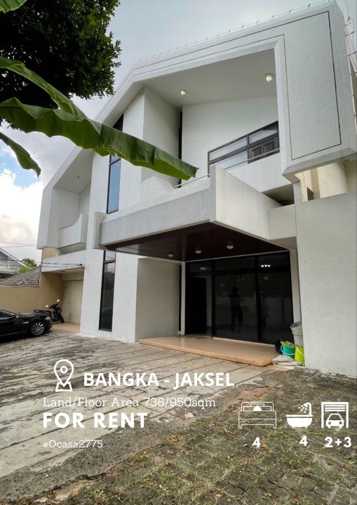 Rumah siap huni disewakan di kawasan Bangka, Jakarta Selatan, LT/LB: 738/950m², 4 KT, 4 KM. Lokasi strategis dengan harga menarik: 600 Juta /tahun.