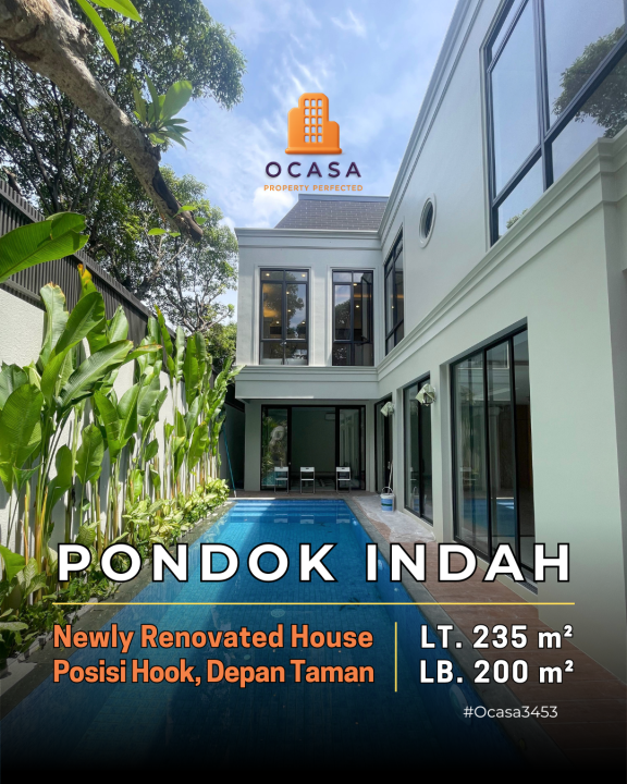 Rumah luxury baru renovasi di Pondok Indah, Jakarta Selatan. Hunian elit dengan 5 kamar tidur dan 4 kamar mandi, LT 235m², LB 200m². Harga eksklusif: 15,9 Miliar. Fasilitas sekitar lengkap.