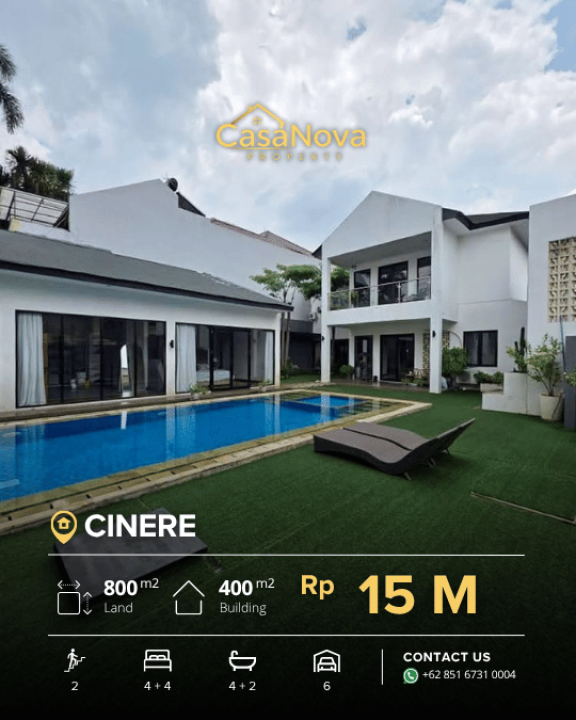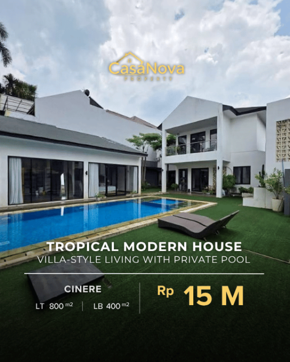 Dijual rumah mewah dan siap huni di Cinere, Depok. Berlokasi di dalam perumahan eksklusif dengan sistem one gate, lingkungan tenang dan aman. Rumah ini mengusung konsep Tropical Modern yang memaksimalkan cahaya alami dan sirkulasi udara. Backyard yang luas, private swimming pool, serta fasilitas lengkap membuat rumah ini ideal untuk keluarga modern.