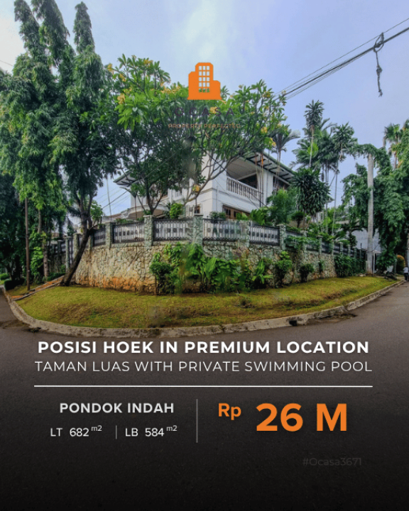Dijual rumah mewah di kawasan Pondok Indah, Jakarta Selatan. Lokasi strategis dekat RSPI, PIM, dan Golf Course. Posisi hoek di jalan lebar, lingkungan tenang dan asri.