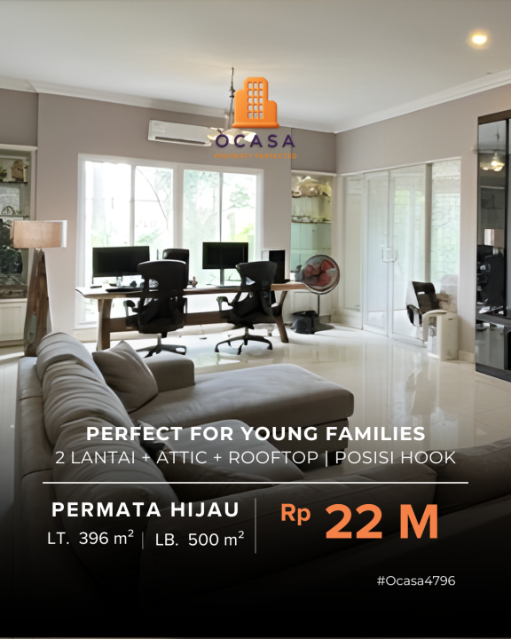 Dijual rumah eksklusif di kawasan elit Permata Hijau, Jakarta Selatan. Dengan desain modern, LT 396m², LB 500m², terdiri dari 3 KT & 3 KM. Harga premium: 22 Miliar. Lingkungan prestisius.