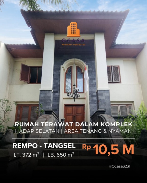 Hunian berkelas di Rempoa, Tangerang Selatan. Memiliki luas tanah 372m² dengan bangunan 650m², terdiri dari 5 kamar tidur & 3 kamar mandi. Harga eksklusif: 10,5 Miliar. Lingkungan privat.