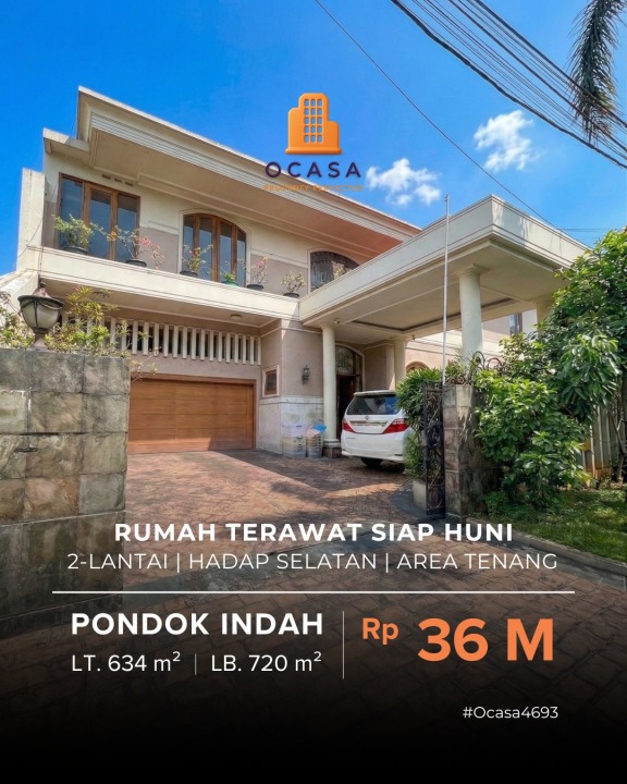 Hunian prestisius di Pondok Indah, Jakarta Selatan. Memiliki luas tanah 634m² dengan bangunan 720m², terdiri dari 5 kamar tidur & 5 kamar mandi. Harga eksklusif: 36 Miliar. Lingkungan privat.
