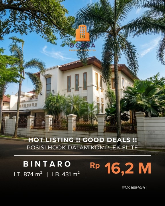 Hunian prestisius di Bintaro, Jakarta Selatan. Memiliki luas tanah 874m² dengan bangunan 431m², terdiri dari 4 kamar tidur & 4 kamar mandi. Harga eksklusif: 16,2 Miliar. Lingkungan privat.