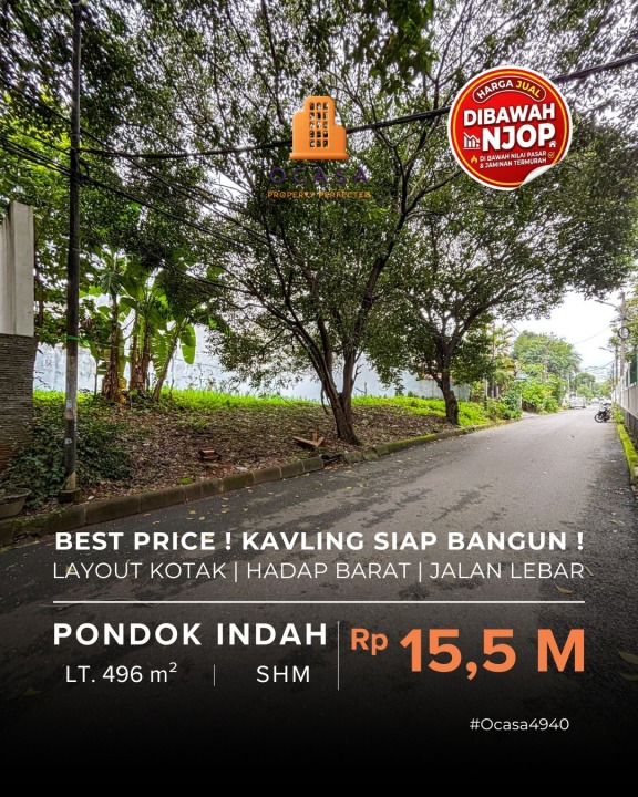 Dijual tanah eksklusif di kawasan elit Pondok Indah, Jakarta Selatan. Luas tanah 496m², harga premium 15,5 Miliar. Cocok untuk hunian mewah atau investasi prestisius.